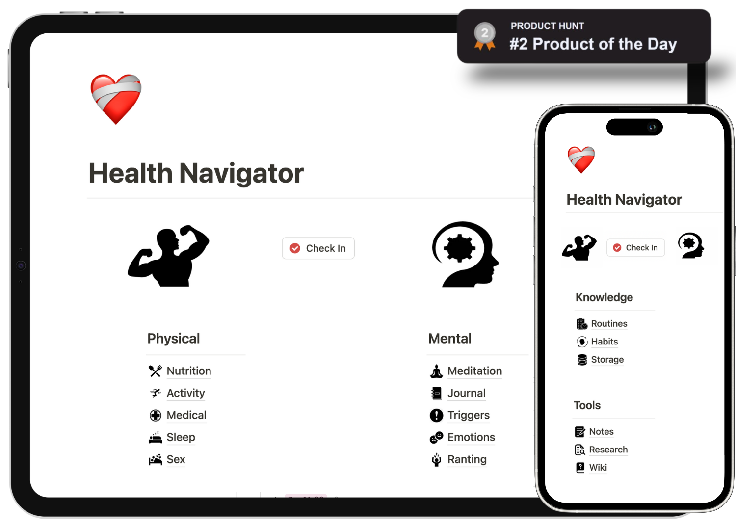 All-in-one health management, tracking and organizing system for Notion designed to supercharge your mental and physical health using the power of a digital Health operating system.