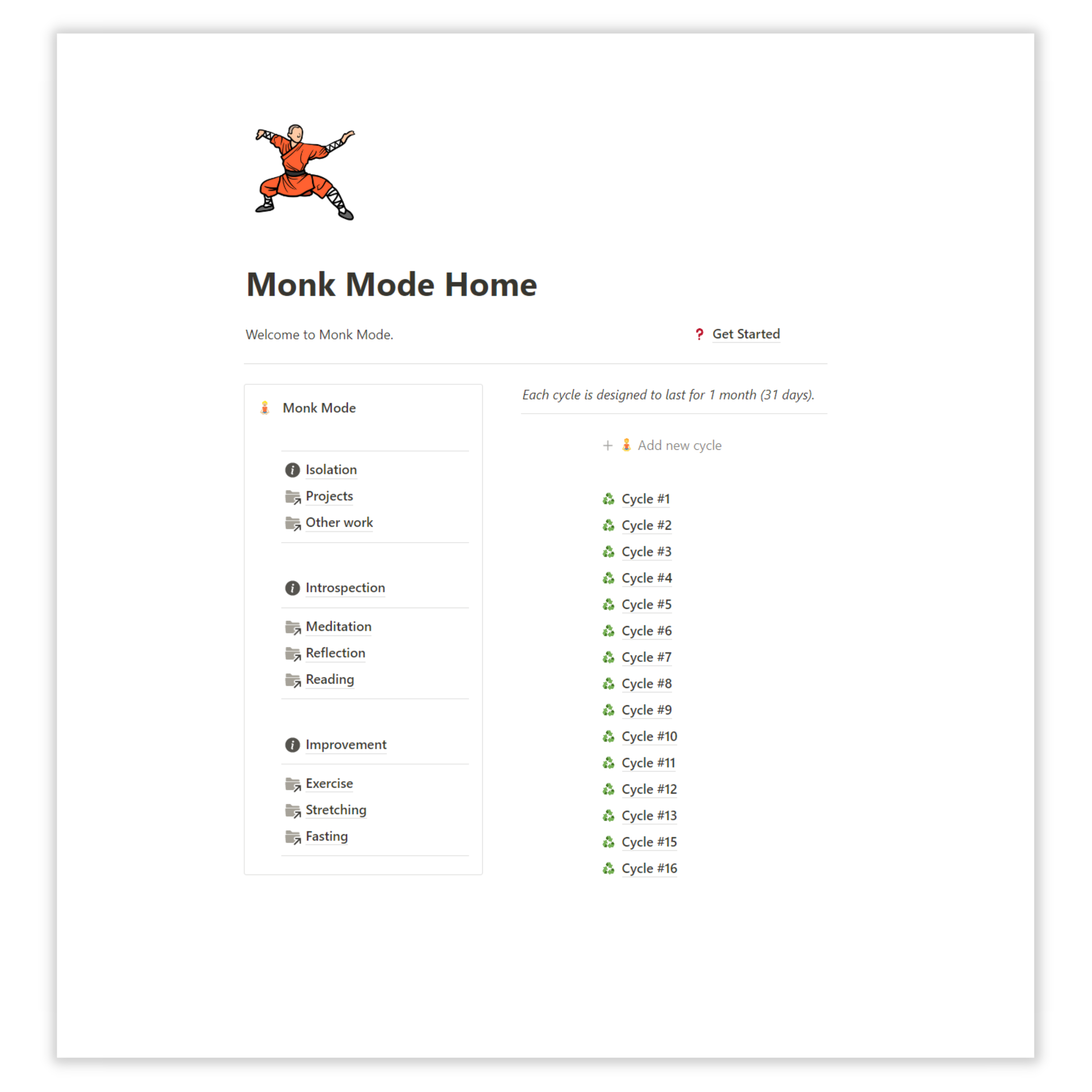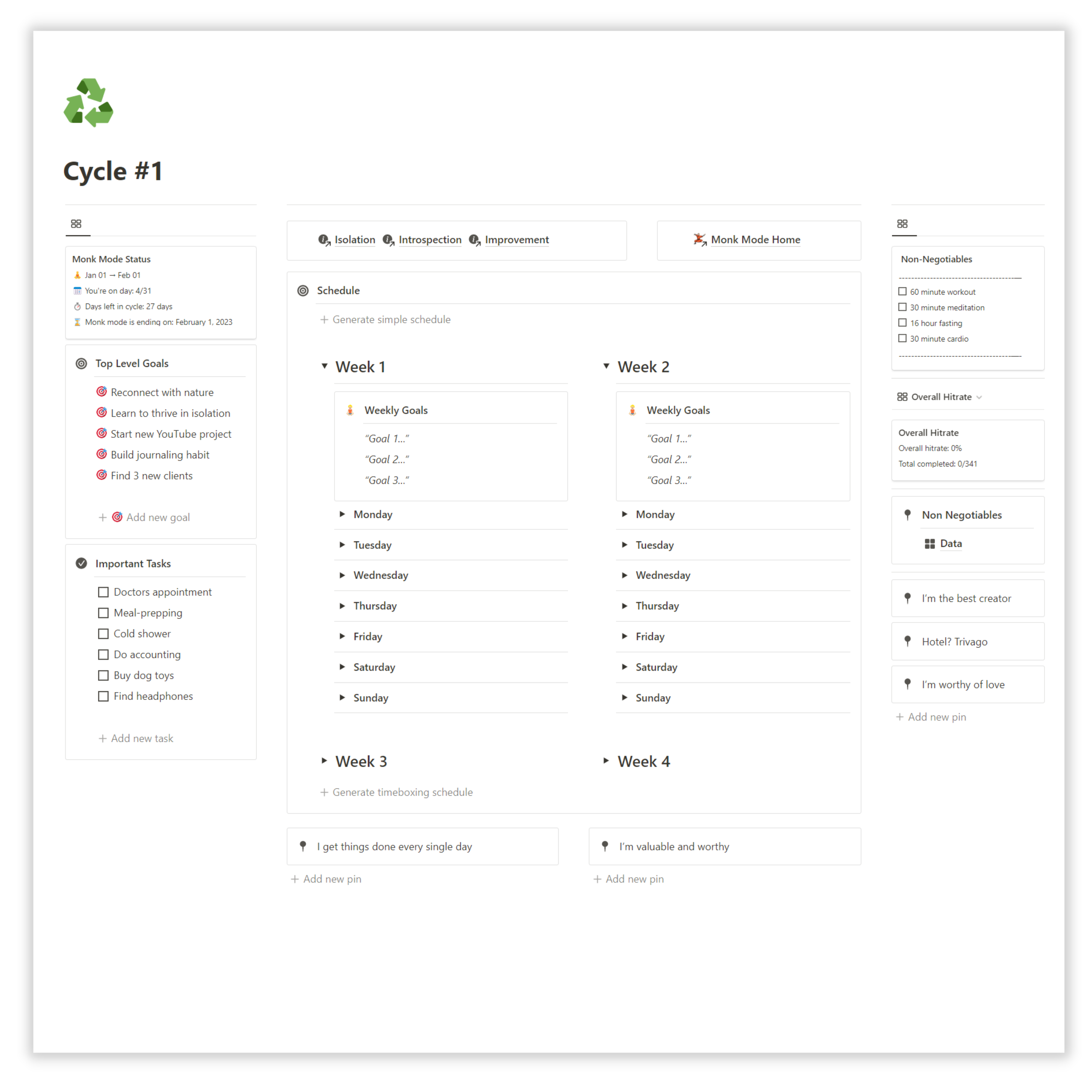 Your 3 I's are the foundation of your Monk Mode practice and gives you a Second Brain-like setup that's built for you to customize and populate with infinite sub-pages with everything you need for Monk Mode.
